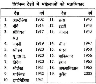 कुवैत जैसे देश में आज भी महिलाओं को मताधिकार प्राप्त नहीं है । अमरीका के राष्ट्रपति पद पर आज तक कोई महिला निर्वाचित नहीं हुई । फ्रांस और जापान जैसे देश की विधायिका में महिला सांसदों का प्रतिशत क्रमश: 7 और 5 से भी नीचे है । लोकतान्त्रिक व्यवस्था के अग्रणी देश ब्रिटेन की संसद में महिला सांसदों की वर्तमान संख्या 18 प्रतिशत तक सीमित है ।